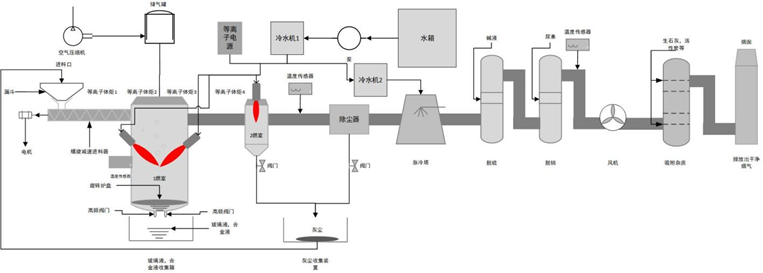 等离子体危废处理系统原理如图所示,利用等离子体的高温将危废裂解。等离子体裂解处理过程可以分为,加热阶段、升温阶段、裂解阶段和焦灰的后燃烧阶段。在等离子体处理系统中,危废投放到第一裂解室的等离子体中,在不低于1200℃~3000℃的高温中被等离子体裂解,分子键裂解成基本原子结构,高熔点的金属氧化物经还原反应被熔化,低沸点的物质被气化、裂解,99.9%的二恶英类的物质能被完全裂解。在此高温中病源微生物等被彻底消灭,被气化及分解出来的气体进入第二裂解室进行再次裂解,彻底消除气体中夹带的飞灰,烟气排出后采用急冷技术使烟气在0.2秒内急速冷却到400℃以下,从而跃过二恶英易生成的温度区后进入尾气处理系统。最后,无机物有害成分在高温下处理成为无害、无毒、无放射性的玻璃体,有效地起到了防止污染的作用。